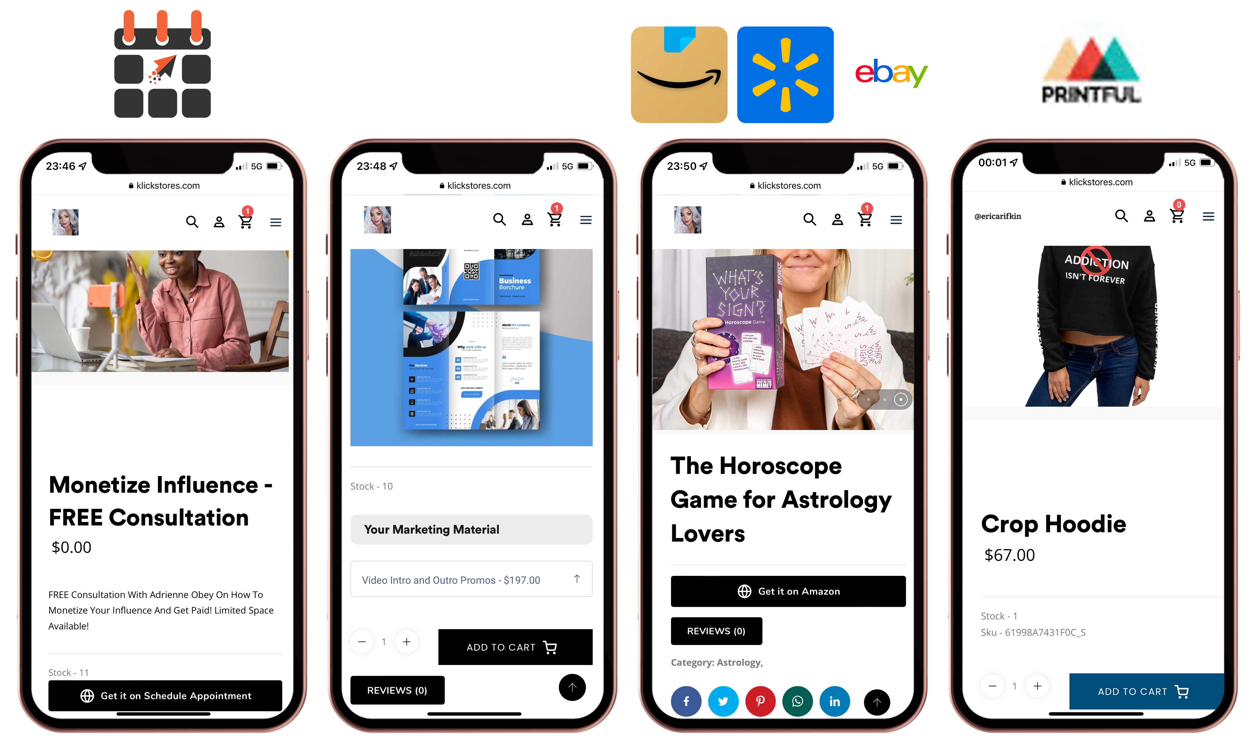 Connect your LinkStore with KlickSchedule for free/paid consultations and services, sell your own physical and digital products directly to your followers, add products from Amazon, Walmart, eBay, and many other places for immediate affiliate commissions, and/or add your print on-demand products to your store with Printful merchandise.Â